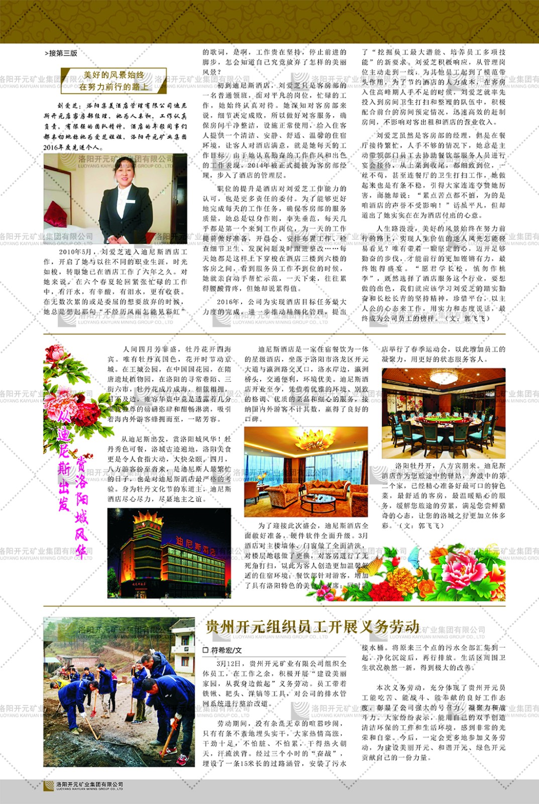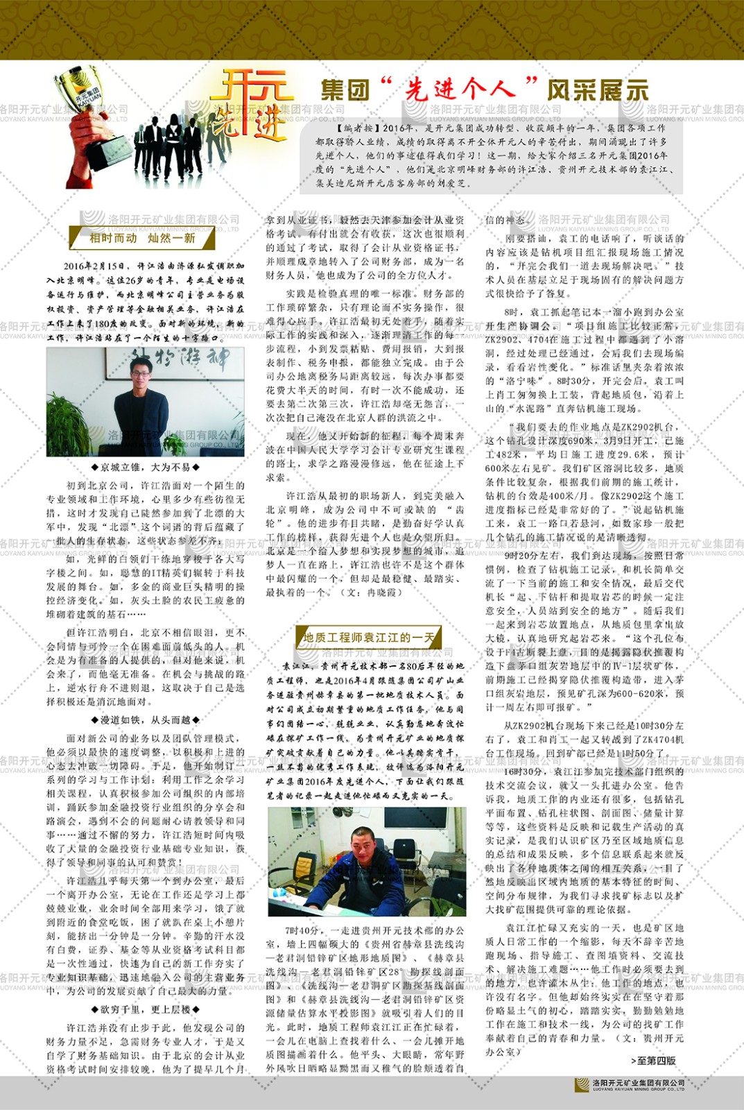 洛陽開元礦業(yè)集團(tuán)有限公司簡介洛陽開元礦業(yè)集團(tuán)有限公司,始成立于2006年,位于洛陽市開元大道269號。集團(tuán)旗下共有五余家全資子公司,業(yè)務(wù)涉及有色金屬礦山開發(fā)、礦產(chǎn)品購銷與進(jìn)出口貿(mào)易、房地產(chǎn)開發(fā)、文化藝術(shù)、企業(yè)管理與咨詢、資本投資等多個領(lǐng)域。民建河南省委委員、民建河南省委企業(yè)委副主任、民建洛陽市委委員、企業(yè)委主任、洛陽民建企業(yè)家協(xié)會會長許明月是公司創(chuàng)始人,現(xiàn)任洛陽開元礦業(yè)集團(tuán)有限公司董事長。在礦業(yè)領(lǐng)域,洛陽開元礦業(yè)集團(tuán)擁有多家實(shí)力雄厚的子公司:貴州開元礦業(yè)有限公司探、采礦權(quán)面積共11.33平方公里;興??h銅鑫礦業(yè)有限公司探礦權(quán)面積8.76平方公里,礦山資源潛力巨大;2021年,開元集團(tuán)與盧氏中科礦業(yè)有限公司開展戰(zhàn)略合作。盧氏中科礦業(yè)有限公司專注于有色金屬的浮選、加工和銷售,擁有強(qiáng)大的技術(shù)支撐平臺,是集探、采、選、冶、研為一體的中大型綜合礦業(yè)企業(yè)。目前,盧氏中科王家河1000噸選礦廠已成功投產(chǎn),雙河金礦、柳關(guān)欒盧鉛鋅礦相繼順利開工,樓房銀礦與圪老灣鉛鋅礦的深部探礦重大突破,標(biāo)志著礦山版圖取得重大進(jìn)展,為開元集團(tuán)后續(xù)發(fā)展奠定了堅實(shí)基礎(chǔ)。在文化傳媒領(lǐng)域,洛陽市明月美術(shù)館通過豐富多樣的藝術(shù)展覽、學(xué)術(shù)研討和公共教育活動,努力打造一個集展覽、交流、教育、研究為一體的綜合性藝術(shù)平臺。此外,在金融投資領(lǐng)域,開元集團(tuán)旗下的北京明峰資本管理有限公司專注于投資具有高增長潛力的優(yōu)秀企業(yè),特別是高科技、新能源、環(huán)保等新興產(chǎn)業(yè),為客戶提供個性化的資產(chǎn)配置服務(wù)。在做好企業(yè)經(jīng)營的同時,開元集團(tuán)始終不忘企業(yè)的社會責(zé)任和家國情懷,以突出的愛心公益事跡,開展了一系列公益慈善活動:“民建林”公益事業(yè)通過“思源基金”“幫幫公益”線上公益平臺,與眾多愛心人士籌措資金20余萬元;資助541名貧困大學(xué)生共計270余萬元,推進(jìn)“數(shù)字助力——河南AI人才培養(yǎng)”;捐款10萬元,馳援京津冀、黑龍江洪水地質(zhì)災(zāi)害……公司于2017年底被洛陽市慈善總會評為“洛陽慈善風(fēng)云榜——十大愛心集體”。洛陽開元礦業(yè)集團(tuán)有限公司秉承持續(xù)發(fā)展理念,憑借多年來良好的企業(yè)信譽(yù)與經(jīng)營業(yè)績,與全國多家企業(yè)建立了良好合作關(guān)系,受到社會各界的一致好評,多次榮獲“納稅標(biāo)兵”“先進(jìn)企業(yè)”“招商引資模范企業(yè)”等榮譽(yù)稱號?;赝麃頃r路,開元人勠力同心,以“闖”的精神和“創(chuàng)”的勁頭,一路披荊斬棘,踏過千山萬水;展望新未來,開元人凝心聚力,不執(zhí)于“舊”,無畏于“新”,秉承“勇于跨越,追求卓越”的企業(yè)精神,乘著國家高質(zhì)量發(fā)展新征程的東風(fēng),跨過高山,越過大海,向著集團(tuán)多元化、國際化的目標(biāo),逐夢遠(yuǎn)航,跨越前行!