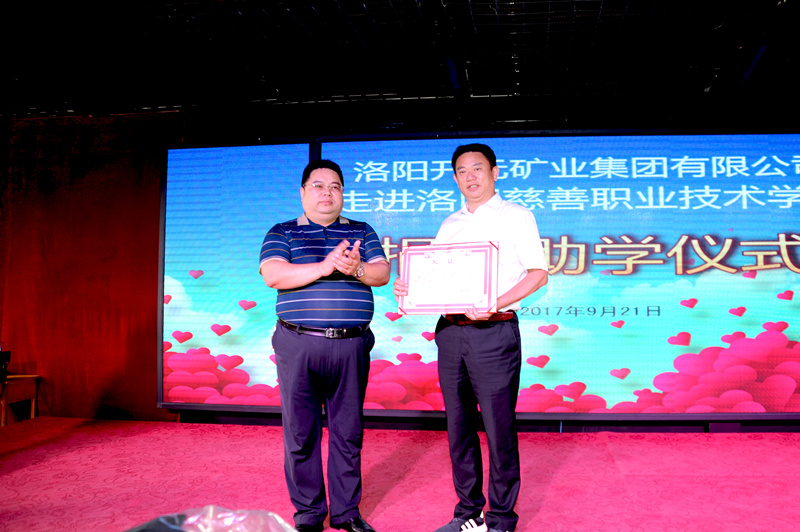 集團副總經(jīng)理楊春生代表洛陽開元礦業(yè)集團向洛陽慈善職業(yè)技術學校捐贈新生校服西裝,洛陽慈善職業(yè)技術學校賈國彪校長為洛陽開元礦業(yè)集團有限公司頒發(fā)榮譽證書,并向全校師生展示新校服。