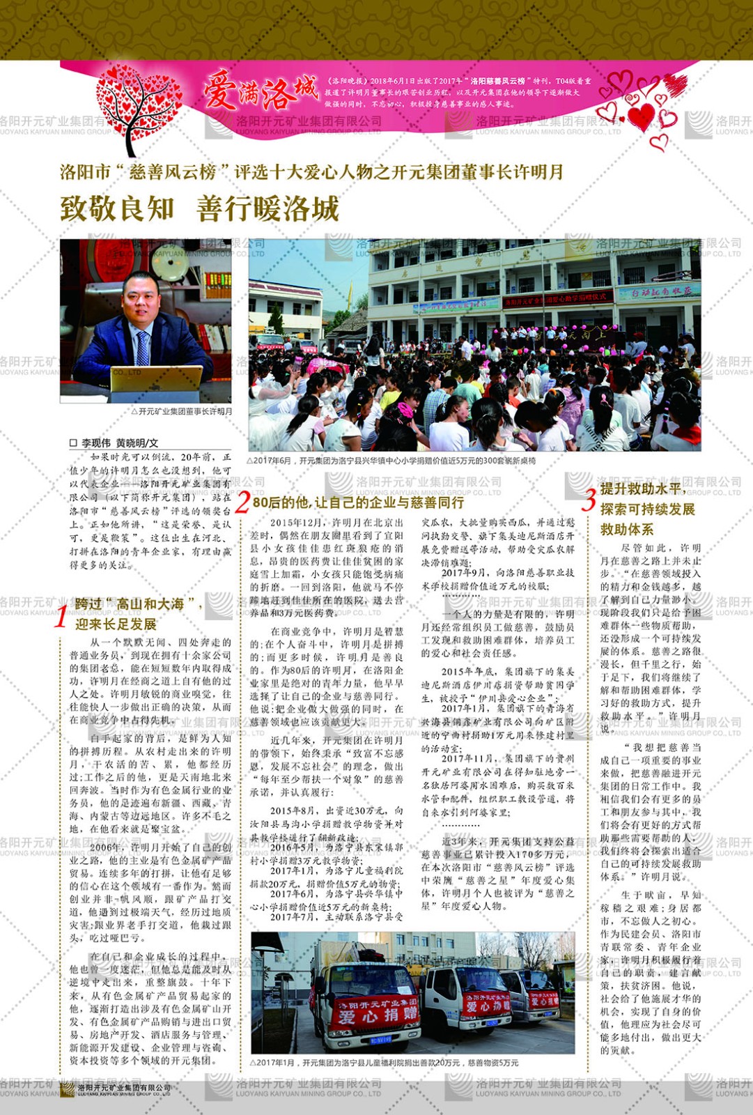 洛陽(yáng)開(kāi)元礦業(yè)集團(tuán)有限公司簡(jiǎn)介洛陽(yáng)開(kāi)元礦業(yè)集團(tuán)有限公司,始成立于2006年,位于洛陽(yáng)市開(kāi)元大道269號(hào)。集團(tuán)旗下共有五余家全資子公司,業(yè)務(wù)涉及有色金屬礦山開(kāi)發(fā)、礦產(chǎn)品購(gòu)銷(xiāo)與進(jìn)出口貿(mào)易、房地產(chǎn)開(kāi)發(fā)、文化藝術(shù)、企業(yè)管理與咨詢、資本投資等多個(gè)領(lǐng)域。民建河南省委委員、民建河南省委企業(yè)委副主任、民建洛陽(yáng)市委委員、企業(yè)委主任、洛陽(yáng)民建企業(yè)家協(xié)會(huì)會(huì)長(zhǎng)許明月是公司創(chuàng)始人,現(xiàn)任洛陽(yáng)開(kāi)元礦業(yè)集團(tuán)有限公司董事長(zhǎng)。在礦業(yè)領(lǐng)域,洛陽(yáng)開(kāi)元礦業(yè)集團(tuán)擁有多家實(shí)力雄厚的子公司:貴州開(kāi)元礦業(yè)有限公司探、采礦權(quán)面積共11.33平方公里;興??h銅鑫礦業(yè)有限公司探礦權(quán)面積8.76平方公里,礦山資源潛力巨大;2021年,開(kāi)元集團(tuán)與盧氏中科礦業(yè)有限公司開(kāi)展戰(zhàn)略合作。盧氏中科礦業(yè)有限公司專(zhuān)注于有色金屬的浮選、加工和銷(xiāo)售,擁有強(qiáng)大的技術(shù)支撐平臺(tái),是集探、采、選、冶、研為一體的中大型綜合礦業(yè)企業(yè)。目前,盧氏中科王家河1000噸選礦廠已成功投產(chǎn),雙河金礦、柳關(guān)欒盧鉛鋅礦相繼順利開(kāi)工,樓房銀礦與圪老灣鉛鋅礦的深部探礦重大突破,標(biāo)志著礦山版圖取得重大進(jìn)展,為開(kāi)元集團(tuán)后續(xù)發(fā)展奠定了堅(jiān)實(shí)基礎(chǔ)。在文化傳媒領(lǐng)域,洛陽(yáng)市明月美術(shù)館通過(guò)豐富多樣的藝術(shù)展覽、學(xué)術(shù)研討和公共教育活動(dòng),努力打造一個(gè)集展覽、交流、教育、研究為一體的綜合性藝術(shù)平臺(tái)。此外,在金融投資領(lǐng)域,開(kāi)元集團(tuán)旗下的北京明峰資本管理有限公司專(zhuān)注于投資具有高增長(zhǎng)潛力的優(yōu)秀企業(yè),特別是高科技、新能源、環(huán)保等新興產(chǎn)業(yè),為客戶提供個(gè)性化的資產(chǎn)配置服務(wù)。在做好企業(yè)經(jīng)營(yíng)的同時(shí),開(kāi)元集團(tuán)始終不忘企業(yè)的社會(huì)責(zé)任和家國(guó)情懷,以突出的愛(ài)心公益事跡,開(kāi)展了一系列公益慈善活動(dòng):“民建林”公益事業(yè)通過(guò)“思源基金”“幫幫公益”線上公益平臺(tái),與眾多愛(ài)心人士籌措資金20余萬(wàn)元;資助541名貧困大學(xué)生共計(jì)270余萬(wàn)元,推進(jìn)“數(shù)字助力——河南AI人才培養(yǎng)”;捐款10萬(wàn)元,馳援京津冀、黑龍江洪水地質(zhì)災(zāi)害……公司于2017年底被洛陽(yáng)市慈善總會(huì)評(píng)為“洛陽(yáng)慈善風(fēng)云榜——十大愛(ài)心集體”。洛陽(yáng)開(kāi)元礦業(yè)集團(tuán)有限公司秉承持續(xù)發(fā)展理念,憑借多年來(lái)良好的企業(yè)信譽(yù)與經(jīng)營(yíng)業(yè)績(jī),與全國(guó)多家企業(yè)建立了良好合作關(guān)系,受到社會(huì)各界的一致好評(píng),多次榮獲“納稅標(biāo)兵”“先進(jìn)企業(yè)”“招商引資模范企業(yè)”等榮譽(yù)稱號(hào)?;赝麃?lái)時(shí)路,開(kāi)元人勠力同心,以“闖”的精神和“創(chuàng)”的勁頭,一路披荊斬棘,踏過(guò)千山萬(wàn)水;展望新未來(lái),開(kāi)元人凝心聚力,不執(zhí)于“舊”,無(wú)畏于“新”,秉承“勇于跨越,追求卓越”的企業(yè)精神,乘著國(guó)家高質(zhì)量發(fā)展新征程的東風(fēng),跨過(guò)高山,越過(guò)大海,向著集團(tuán)多元化、國(guó)際化的目標(biāo),逐夢(mèng)遠(yuǎn)航,跨越前行!