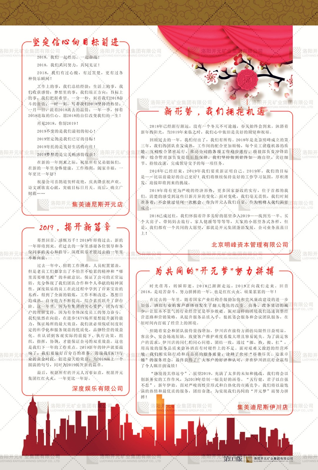 洛陽開元礦業(yè)集團(tuán)有限公司簡介洛陽開元礦業(yè)集團(tuán)有限公司,始成立于2006年,位于洛陽市開元大道269號。集團(tuán)旗下共有五余家全資子公司,業(yè)務(wù)涉及有色金屬礦山開發(fā)、礦產(chǎn)品購銷與進(jìn)出口貿(mào)易、房地產(chǎn)開發(fā)、文化藝術(shù)、企業(yè)管理與咨詢、資本投資等多個(gè)領(lǐng)域。民建河南省委委員、民建河南省委企業(yè)委副主任、民建洛陽市委委員、企業(yè)委主任、洛陽民建企業(yè)家協(xié)會會長許明月是公司創(chuàng)始人,現(xiàn)任洛陽開元礦業(yè)集團(tuán)有限公司董事長。在礦業(yè)領(lǐng)域,洛陽開元礦業(yè)集團(tuán)擁有多家實(shí)力雄厚的子公司:貴州開元礦業(yè)有限公司探、采礦權(quán)面積共11.33平方公里;興海縣銅鑫礦業(yè)有限公司探礦權(quán)面積8.76平方公里,礦山資源潛力巨大;2021年,開元集團(tuán)與盧氏中科礦業(yè)有限公司開展戰(zhàn)略合作。盧氏中科礦業(yè)有限公司專注于有色金屬的浮選、加工和銷售,擁有強(qiáng)大的技術(shù)支撐平臺,是集探、采、選、冶、研為一體的中大型綜合礦業(yè)企業(yè)。目前,盧氏中科王家河1000噸選礦廠已成功投產(chǎn),雙河金礦、柳關(guān)欒盧鉛鋅礦相繼順利開工,樓房銀礦與圪老灣鉛鋅礦的深部探礦重大突破,標(biāo)志著礦山版圖取得重大進(jìn)展,為開元集團(tuán)后續(xù)發(fā)展奠定了堅(jiān)實(shí)基礎(chǔ)。在文化傳媒領(lǐng)域,洛陽市明月美術(shù)館通過豐富多樣的藝術(shù)展覽、學(xué)術(shù)研討和公共教育活動(dòng),努力打造一個(gè)集展覽、交流、教育、研究為一體的綜合性藝術(shù)平臺。此外,在金融投資領(lǐng)域,開元集團(tuán)旗下的北京明峰資本管理有限公司專注于投資具有高增長潛力的優(yōu)秀企業(yè),特別是高科技、新能源、環(huán)保等新興產(chǎn)業(yè),為客戶提供個(gè)性化的資產(chǎn)配置服務(wù)。在做好企業(yè)經(jīng)營的同時(shí),開元集團(tuán)始終不忘企業(yè)的社會責(zé)任和家國情懷,以突出的愛心公益事跡,開展了一系列公益慈善活動(dòng):“民建林”公益事業(yè)通過“思源基金”“幫幫公益”線上公益平臺,與眾多愛心人士籌措資金20余萬元;資助541名貧困大學(xué)生共計(jì)270余萬元,推進(jìn)“數(shù)字助力——河南AI人才培養(yǎng)”;捐款10萬元,馳援京津冀、黑龍江洪水地質(zhì)災(zāi)害……公司于2017年底被洛陽市慈善總會評為“洛陽慈善風(fēng)云榜——十大愛心集體”。洛陽開元礦業(yè)集團(tuán)有限公司秉承持續(xù)發(fā)展理念,憑借多年來良好的企業(yè)信譽(yù)與經(jīng)營業(yè)績,與全國多家企業(yè)建立了良好合作關(guān)系,受到社會各界的一致好評,多次榮獲“納稅標(biāo)兵”“先進(jìn)企業(yè)”“招商引資模范企業(yè)”等榮譽(yù)稱號。回望來時(shí)路,開元人勠力同心,以“闖”的精神和“創(chuàng)”的勁頭,一路披荊斬棘,踏過千山萬水;展望新未來,開元人凝心聚力,不執(zhí)于“舊”,無畏于“新”,秉承“勇于跨越,追求卓越”的企業(yè)精神,乘著國家高質(zhì)量發(fā)展新征程的東風(fēng),跨過高山,越過大海,向著集團(tuán)多元化、國際化的目標(biāo),逐夢遠(yuǎn)航,跨越前行!
