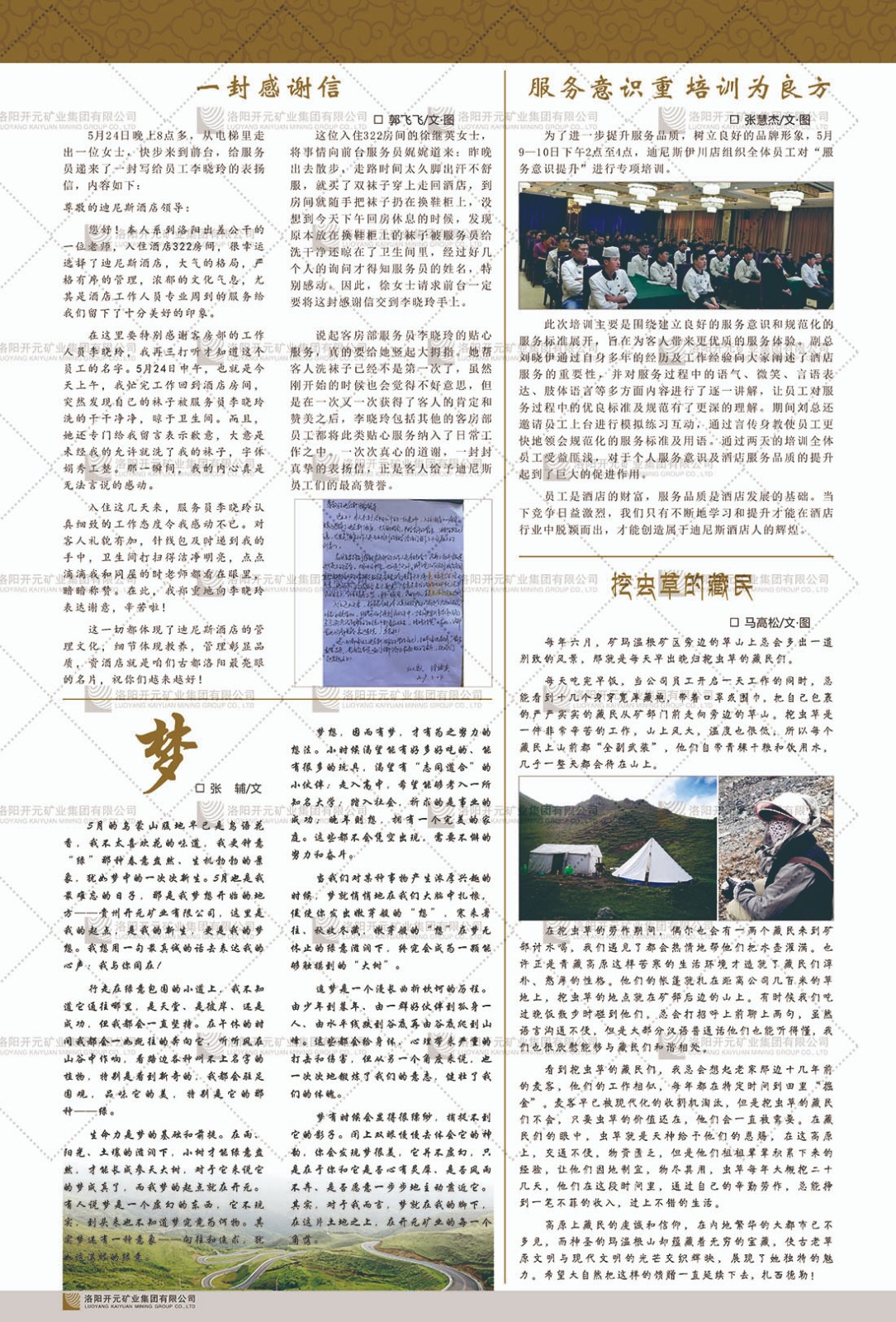 洛陽開元礦業(yè)集團(tuán)有限公司簡(jiǎn)介洛陽開元礦業(yè)集團(tuán)有限公司,始成立于2006年,位于洛陽市開元大道269號(hào)。集團(tuán)旗下共有五余家全資子公司,業(yè)務(wù)涉及有色金屬礦山開發(fā)、礦產(chǎn)品購銷與進(jìn)出口貿(mào)易、房地產(chǎn)開發(fā)、文化藝術(shù)、企業(yè)管理與咨詢、資本投資等多個(gè)領(lǐng)域。民建河南省委委員、民建河南省委企業(yè)委副主任、民建洛陽市委委員、企業(yè)委主任、洛陽民建企業(yè)家協(xié)會(huì)會(huì)長(zhǎng)許明月是公司創(chuàng)始人,現(xiàn)任洛陽開元礦業(yè)集團(tuán)有限公司董事長(zhǎng)。在礦業(yè)領(lǐng)域,洛陽開元礦業(yè)集團(tuán)擁有多家實(shí)力雄厚的子公司:貴州開元礦業(yè)有限公司探、采礦權(quán)面積共11.33平方公里;興??h銅鑫礦業(yè)有限公司探礦權(quán)面積8.76平方公里,礦山資源潛力巨大;2021年,開元集團(tuán)與盧氏中科礦業(yè)有限公司開展戰(zhàn)略合作。盧氏中科礦業(yè)有限公司專注于有色金屬的浮選、加工和銷售,擁有強(qiáng)大的技術(shù)支撐平臺(tái),是集探、采、選、冶、研為一體的中大型綜合礦業(yè)企業(yè)。目前,盧氏中科王家河1000噸選礦廠已成功投產(chǎn),雙河金礦、柳關(guān)欒盧鉛鋅礦相繼順利開工,樓房銀礦與圪老灣鉛鋅礦的深部探礦重大突破,標(biāo)志著礦山版圖取得重大進(jìn)展,為開元集團(tuán)后續(xù)發(fā)展奠定了堅(jiān)實(shí)基礎(chǔ)。在文化傳媒領(lǐng)域,洛陽市明月美術(shù)館通過豐富多樣的藝術(shù)展覽、學(xué)術(shù)研討和公共教育活動(dòng),努力打造一個(gè)集展覽、交流、教育、研究為一體的綜合性藝術(shù)平臺(tái)。此外,在金融投資領(lǐng)域,開元集團(tuán)旗下的北京明峰資本管理有限公司專注于投資具有高增長(zhǎng)潛力的優(yōu)秀企業(yè),特別是高科技、新能源、環(huán)保等新興產(chǎn)業(yè),為客戶提供個(gè)性化的資產(chǎn)配置服務(wù)。在做好企業(yè)經(jīng)營的同時(shí),開元集團(tuán)始終不忘企業(yè)的社會(huì)責(zé)任和家國情懷,以突出的愛心公益事跡,開展了一系列公益慈善活動(dòng):“民建林”公益事業(yè)通過“思源基金”“幫幫公益”線上公益平臺(tái),與眾多愛心人士籌措資金20余萬元;資助541名貧困大學(xué)生共計(jì)270余萬元,推進(jìn)“數(shù)字助力——河南AI人才培養(yǎng)”;捐款10萬元,馳援京津冀、黑龍江洪水地質(zhì)災(zāi)害……公司于2017年底被洛陽市慈善總會(huì)評(píng)為“洛陽慈善風(fēng)云榜——十大愛心集體”。洛陽開元礦業(yè)集團(tuán)有限公司秉承持續(xù)發(fā)展理念,憑借多年來良好的企業(yè)信譽(yù)與經(jīng)營業(yè)績(jī),與全國多家企業(yè)建立了良好合作關(guān)系,受到社會(huì)各界的一致好評(píng),多次榮獲“納稅標(biāo)兵”“先進(jìn)企業(yè)”“招商引資模范企業(yè)”等榮譽(yù)稱號(hào)?;赝麃頃r(shí)路,開元人勠力同心,以“闖”的精神和“創(chuàng)”的勁頭,一路披荊斬棘,踏過千山萬水;展望新未來,開元人凝心聚力,不執(zhí)于“舊”,無畏于“新”,秉承“勇于跨越,追求卓越”的企業(yè)精神,乘著國家高質(zhì)量發(fā)展新征程的東風(fēng),跨過高山,越過大海,向著集團(tuán)多元化、國際化的目標(biāo),逐夢(mèng)遠(yuǎn)航,跨越前行!