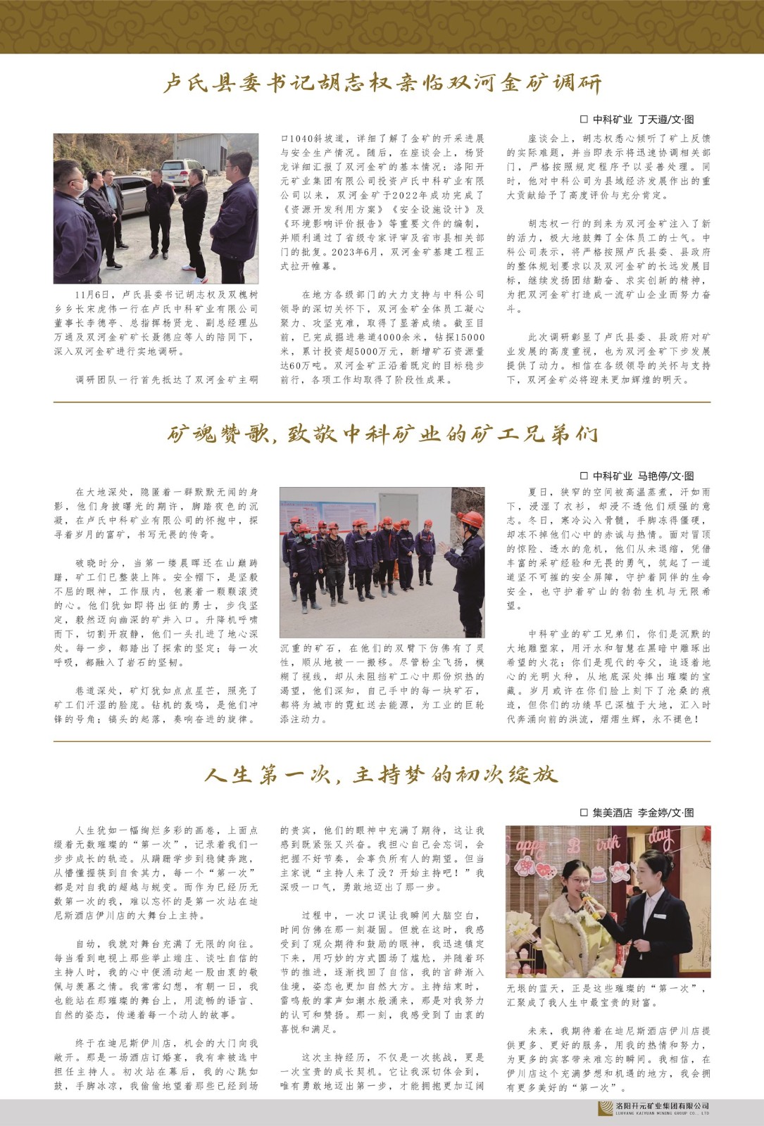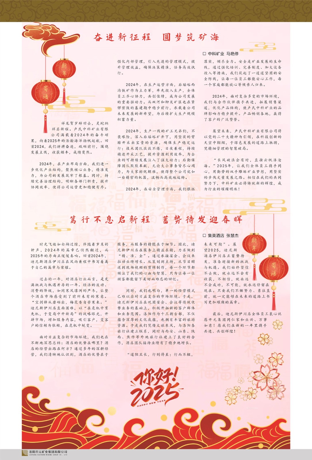洛陽(yáng)開(kāi)元礦業(yè)集團(tuán)有限公司簡(jiǎn)介洛陽(yáng)開(kāi)元礦業(yè)集團(tuán)有限公司,始成立于2006年,位于洛陽(yáng)市開(kāi)元大道269號(hào)。集團(tuán)旗下共有五余家全資子公司,業(yè)務(wù)涉及有色金屬礦山開(kāi)發(fā)、礦產(chǎn)品購(gòu)銷與進(jìn)出口貿(mào)易、房地產(chǎn)開(kāi)發(fā)、文化藝術(shù)、企業(yè)管理與咨詢、資本投資等多個(gè)領(lǐng)域。民建河南省委委員、民建河南省委企業(yè)委副主任、民建洛陽(yáng)市委委員、企業(yè)委主任、洛陽(yáng)民建企業(yè)家協(xié)會(huì)會(huì)長(zhǎng)許明月是公司創(chuàng)始人,現(xiàn)任洛陽(yáng)開(kāi)元礦業(yè)集團(tuán)有限公司董事長(zhǎng)。在礦業(yè)領(lǐng)域,洛陽(yáng)開(kāi)元礦業(yè)集團(tuán)擁有多家實(shí)力雄厚的子公司:貴州開(kāi)元礦業(yè)有限公司探、采礦權(quán)面積共11.33平方公里;興海縣銅鑫礦業(yè)有限公司探礦權(quán)面積8.76平方公里,礦山資源潛力巨大;2021年,開(kāi)元集團(tuán)與盧氏中科礦業(yè)有限公司開(kāi)展戰(zhàn)略合作。盧氏中科礦業(yè)有限公司專注于有色金屬的浮選、加工和銷售,擁有強(qiáng)大的技術(shù)支撐平臺(tái),是集探、采、選、冶、研為一體的中大型綜合礦業(yè)企業(yè)。目前,盧氏中科王家河1000噸選礦廠已成功投產(chǎn),雙河金礦、柳關(guān)欒盧鉛鋅礦相繼順利開(kāi)工,樓房銀礦與圪老灣鉛鋅礦的深部探礦重大突破,標(biāo)志著礦山版圖取得重大進(jìn)展,為開(kāi)元集團(tuán)后續(xù)發(fā)展奠定了堅(jiān)實(shí)基礎(chǔ)。在文化傳媒領(lǐng)域,洛陽(yáng)市明月美術(shù)館通過(guò)豐富多樣的藝術(shù)展覽、學(xué)術(shù)研討和公共教育活動(dòng),努力打造一個(gè)集展覽、交流、教育、研究為一體的綜合性藝術(shù)平臺(tái)。此外,在金融投資領(lǐng)域,開(kāi)元集團(tuán)旗下的北京明峰資本管理有限公司專注于投資具有高增長(zhǎng)潛力的優(yōu)秀企業(yè),特別是高科技、新能源、環(huán)保等新興產(chǎn)業(yè),為客戶提供個(gè)性化的資產(chǎn)配置服務(wù)。在做好企業(yè)經(jīng)營(yíng)的同時(shí),開(kāi)元集團(tuán)始終不忘企業(yè)的社會(huì)責(zé)任和家國(guó)情懷,以突出的愛(ài)心公益事跡,開(kāi)展了一系列公益慈善活動(dòng):“民建林”公益事業(yè)通過(guò)“思源基金”“幫幫公益”線上公益平臺(tái),與眾多愛(ài)心人士籌措資金20余萬(wàn)元;資助541名貧困大學(xué)生共計(jì)270余萬(wàn)元,推進(jìn)“數(shù)字助力——河南AI人才培養(yǎng)”;捐款10萬(wàn)元,馳援京津冀、黑龍江洪水地質(zhì)災(zāi)害……公司于2017年底被洛陽(yáng)市慈善總會(huì)評(píng)為“洛陽(yáng)慈善風(fēng)云榜——十大愛(ài)心集體”。洛陽(yáng)開(kāi)元礦業(yè)集團(tuán)有限公司秉承持續(xù)發(fā)展理念,憑借多年來(lái)良好的企業(yè)信譽(yù)與經(jīng)營(yíng)業(yè)績(jī),與全國(guó)多家企業(yè)建立了良好合作關(guān)系,受到社會(huì)各界的一致好評(píng),多次榮獲“納稅標(biāo)兵”“先進(jìn)企業(yè)”“招商引資模范企業(yè)”等榮譽(yù)稱號(hào)?;赝麃?lái)時(shí)路,開(kāi)元人勠力同心,以“闖”的精神和“創(chuàng)”的勁頭,一路披荊斬棘,踏過(guò)千山萬(wàn)水;展望新未來(lái),開(kāi)元人凝心聚力,不執(zhí)于“舊”,無(wú)畏于“新”,秉承“勇于跨越,追求卓越”的企業(yè)精神,乘著國(guó)家高質(zhì)量發(fā)展新征程的東風(fēng),跨過(guò)高山,越過(guò)大海,向著集團(tuán)多元化、國(guó)際化的目標(biāo),逐夢(mèng)遠(yuǎn)航,跨越前行!