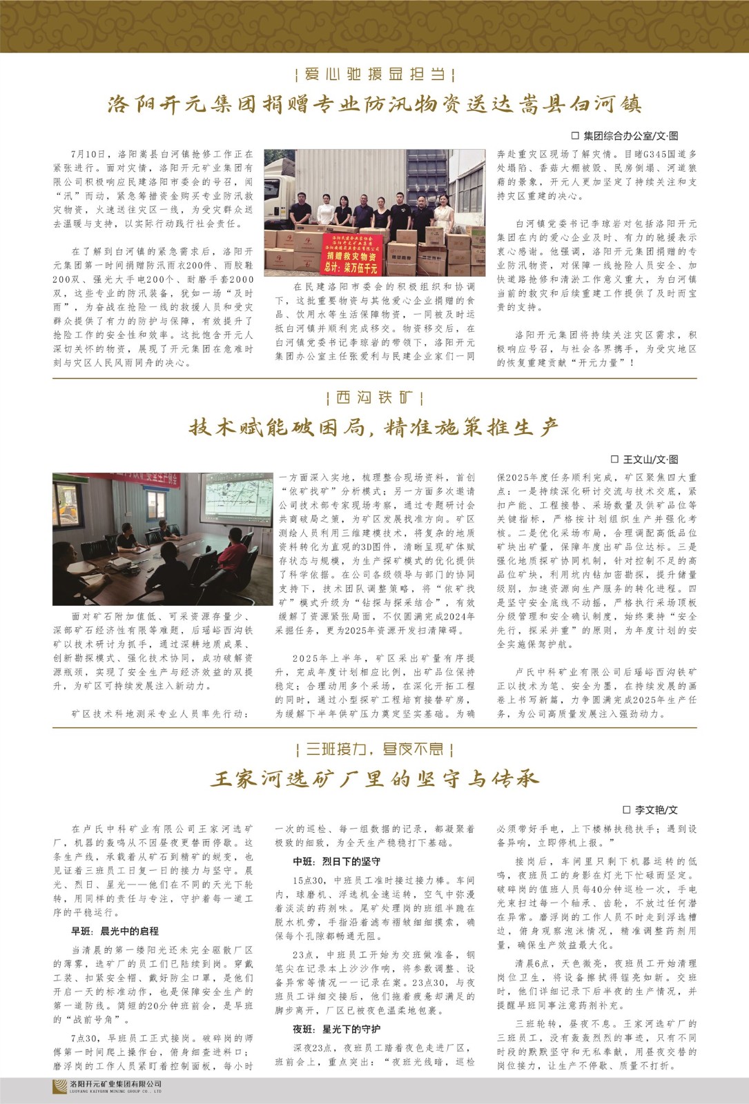 洛陽開元礦業(yè)集團(tuán)有限公司簡介洛陽開元礦業(yè)集團(tuán)有限公司,始成立于2006年,位于洛陽市開元大道269號。集團(tuán)旗下共有五余家全資子公司,業(yè)務(wù)涉及有色金屬礦山開發(fā)、礦產(chǎn)品購銷與進(jìn)出口貿(mào)易、房地產(chǎn)開發(fā)、文化藝術(shù)、企業(yè)管理與咨詢、資本投資等多個(gè)領(lǐng)域。民建河南省委委員、民建河南省委企業(yè)委副主任、民建洛陽市委委員、企業(yè)委主任、洛陽民建企業(yè)家協(xié)會(huì)會(huì)長許明月是公司創(chuàng)始人,現(xiàn)任洛陽開元礦業(yè)集團(tuán)有限公司董事長。在礦業(yè)領(lǐng)域,洛陽開元礦業(yè)集團(tuán)擁有多家實(shí)力雄厚的子公司:貴州開元礦業(yè)有限公司探、采礦權(quán)面積共11.33平方公里;興??h銅鑫礦業(yè)有限公司探礦權(quán)面積8.76平方公里,礦山資源潛力巨大;2021年,開元集團(tuán)與盧氏中科礦業(yè)有限公司開展戰(zhàn)略合作。盧氏中科礦業(yè)有限公司專注于有色金屬的浮選、加工和銷售,擁有強(qiáng)大的技術(shù)支撐平臺,是集探、采、選、冶、研為一體的中大型綜合礦業(yè)企業(yè)。目前,盧氏中科王家河1000噸選礦廠已成功投產(chǎn),雙河金礦、柳關(guān)欒盧鉛鋅礦相繼順利開工,樓房銀礦與圪老灣鉛鋅礦的深部探礦重大突破,標(biāo)志著礦山版圖取得重大進(jìn)展,為開元集團(tuán)后續(xù)發(fā)展奠定了堅(jiān)實(shí)基礎(chǔ)。在文化傳媒領(lǐng)域,洛陽市明月美術(shù)館通過豐富多樣的藝術(shù)展覽、學(xué)術(shù)研討和公共教育活動(dòng),努力打造一個(gè)集展覽、交流、教育、研究為一體的綜合性藝術(shù)平臺。此外,在金融投資領(lǐng)域,開元集團(tuán)旗下的北京明峰資本管理有限公司專注于投資具有高增長潛力的優(yōu)秀企業(yè),特別是高科技、新能源、環(huán)保等新興產(chǎn)業(yè),為客戶提供個(gè)性化的資產(chǎn)配置服務(wù)。在做好企業(yè)經(jīng)營的同時(shí),開元集團(tuán)始終不忘企業(yè)的社會(huì)責(zé)任和家國情懷,以突出的愛心公益事跡,開展了一系列公益慈善活動(dòng):“民建林”公益事業(yè)通過“思源基金”“幫幫公益”線上公益平臺,與眾多愛心人士籌措資金20余萬元;資助541名貧困大學(xué)生共計(jì)270余萬元,推進(jìn)“數(shù)字助力——河南AI人才培養(yǎng)”;捐款10萬元,馳援京津冀、黑龍江洪水地質(zhì)災(zāi)害……公司于2017年底被洛陽市慈善總會(huì)評為“洛陽慈善風(fēng)云榜——十大愛心集體”。洛陽開元礦業(yè)集團(tuán)有限公司秉承持續(xù)發(fā)展理念,憑借多年來良好的企業(yè)信譽(yù)與經(jīng)營業(yè)績,與全國多家企業(yè)建立了良好合作關(guān)系,受到社會(huì)各界的一致好評,多次榮獲“納稅標(biāo)兵”“先進(jìn)企業(yè)”“招商引資模范企業(yè)”等榮譽(yù)稱號?;赝麃頃r(shí)路,開元人勠力同心,以“闖”的精神和“創(chuàng)”的勁頭,一路披荊斬棘,踏過千山萬水;展望新未來,開元人凝心聚力,不執(zhí)于“舊”,無畏于“新”,秉承“勇于跨越,追求卓越”的企業(yè)精神,乘著國家高質(zhì)量發(fā)展新征程的東風(fēng),跨過高山,越過大海,向著集團(tuán)多元化、國際化的目標(biāo),逐夢遠(yuǎn)航,跨越前行!